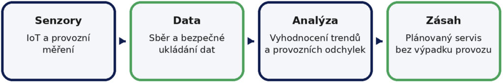 - Analýza dat a modely: Surová data sama o sobě nestačí. Hodnotu dává až interpretace. V jednodušším režimu jde o prahové hodnoty a trendování (např. rostoucí odběr proudu při stejné zátěži), ve vyspělejším o korelace a modely predikce poruch (např. odhad zbývající životnosti komponent). Díky tomu místo jednorázových „snapshots“ získáváte řídící nástroj a můžete cílit zásah jen na zařízení, která se skutečně zhoršují.